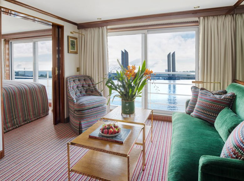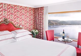 Lavishly appointed river view stateroom (151 sq ft - 14 sq m) with full picture windows. Please note category 3 staterooms have smaller windows.Handcrafted Savoir of England beds draped in fine linens with choice pillows, built-in closets, hair dryer, safe, individual thermostat, flat-screen TV with infotainment centre and satellite, and bottled waterBathroom features L'Occitane en Provence bath and body products, plush towels, waffle bathrobes, and slippers