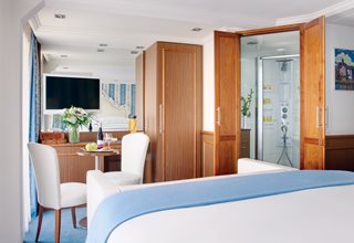 Luxurious riverview stateroom (140 sq ft - 13 sq m) with a French balcony.Handcrafted Savoir® Beds of England, built-in closets, hair dryer, safe, individual climate-controlled thermostat, direct-dial telephone, and flat-screen TV with infotainment center.Marble bathroom with Asprey bath and body products, plush towels, backlit magnifying mirror, cozy bathrobes and slippers.