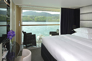 At 475ft², this suite is the largest on the ship. At the rear of the Diamond Deck, enjoy panoramic views of the breathtaking passing scenery through floor to ceiling windows across two walls of the cabin.The suite includes a private balcony with a 'Sun Lounge' along with individual climate control within the suite itself. The spacious bedroom area has a Queen-size Scenic 'Slumber bed' with Egyptian cotton linen and pillow menu. The spacious bathroom with bath and shower is well stocked with L'Occitaine toiletries as well as a hairdryer, bathrobes and slippers. The lounge area boasts a complimentary in-suite mini-bar, restocked daily. The suite has a Flat screen HDTV linked to Mac Mini, complementary WiFi and use of a telephone. A safe is also provided for your valuables. €100pp credit is also provided for use in the Wellness Centre. A Private Chauffeur will also be available in selected locations.Guests staying within a Royal Panorama Suite will be provided with Butler service. This lavish service will include champagne on arrival and luggage unpacking/packing. A shoeshine service is available as well as unlimited laundry and pressing. A morning newspaper of choice will be delivered along with breakfast in suite. Fruit skewers, drinks, pre-dinner canapés and post-dinner petit fours will be delivered daily. Guests will also be invited to dine at Table La Rive.